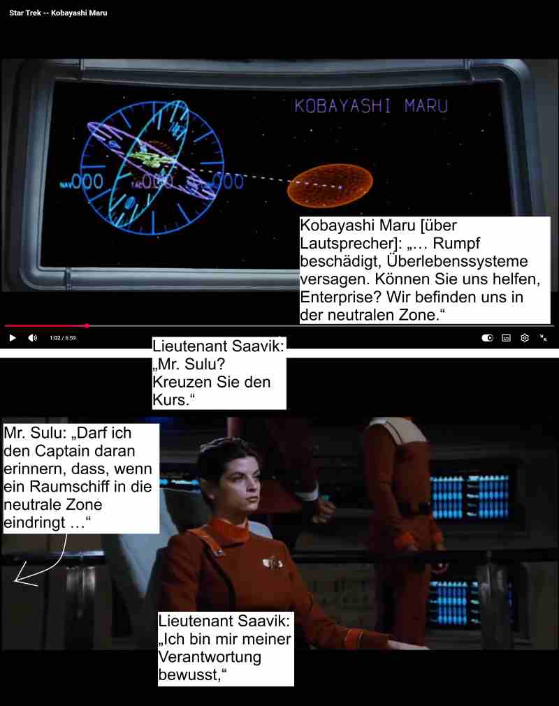 Der Kobayashi-Maru-Test ist ein Übungsszenario im Star-Trek-Universum, welches NICHT zu bestehen ist. Es soll die Charakterstärke der Kadetten an der Sternenflottenakademie in einem No-Win-Szenario getestet werden. Das Ziel der Übung ist es, das zivile Raumschiff Kobayashi Maru in einer simulierten Schlacht vor den feindlichen Klingonen zu retten. Das beschädigte Schiff befindet sich in der klingonischen neutralen Zone, und jedes Schiff der Sternenflotte, das in die Zone eintritt, würde einen interstellaren Vorfall verursachen. Die getestete Kadett muss entscheiden, ob er entgegen der Sternenflottendirektive in die neutrale Zone eindringt und die Rettung der Besatzung versuchen will und dadurch das eigene Schiff gefährdet, oder ob er die Kobayashi Maru ihrer sicheren Zerstörung überlässt. Wenn der kommandoführende Kadett sich für eine Rettung entscheidet, soll die Simulation dafür sorgen, dass das Schiff des Kadetten unter Verlust aller Besatzungsmitglieder zerstört wird. Hier ist die Szene auf „Star Trek — Kobayashi Maru“ https://www.youtube.com/watch?v=IjW8XkqIwzQ von „Frustrated Idealist“ (man kann Untertitel anzeigen und von Englisch nach Deutsch übersetzen lassen).