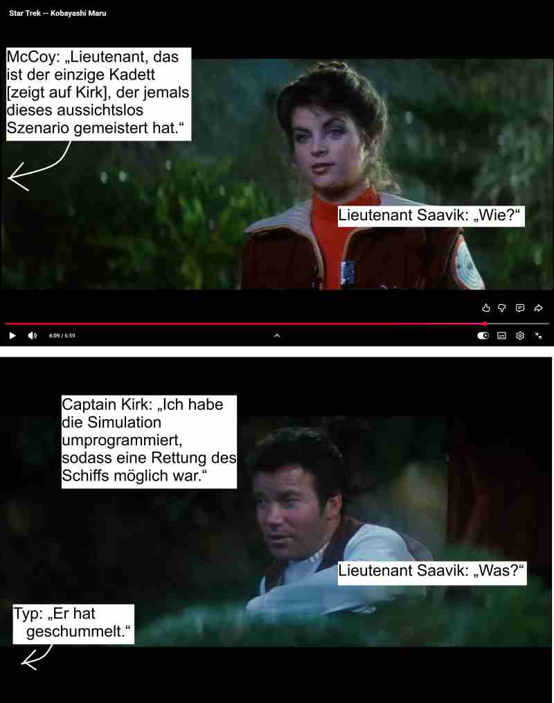 Das Szenario wird niemals von den Kadetten bestanden. Sie wissen vorher aber nicht, dass es ein No-Win-Szenario ist – hier schafft es Lieutenant Saavik auch nicht. Nur EIN Mensch hat das Kobayashi-Maru-Szenario jemals bestanden – der berühmte Captain Kirk (Wiki en. https://en.wikipedia.org/wiki/James_T._Kirk), indem er nämlich …