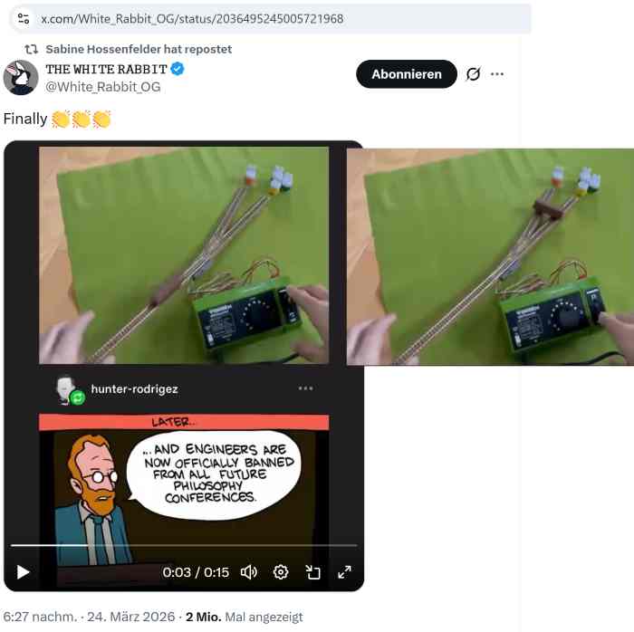 Das ist insofern sehr interessant, weil in einem Tweet https://x.com/White_Rabbit_OG/status/2036495245005721968 von Sabine Hossenfelder retweetet, etwas SEHR ähnliches vorkommt. In dem berühmten Weichenstellerfall (Wiki https://de.wikipedia.org/wiki/Trolley-Problem) rast ein Zug auf fünf Menschen zu, die auf dem Gleis gefesselt sind. Du kannst eine Weiche umstellen, sodass der Zug auf ein anderes Gleis fährt. Dort steht jedoch eine einzelne Person, die dann sterben würde. Natürlich ist die Frage bei Philosophen, was man tun sollte. Aber nach dem Tweet …